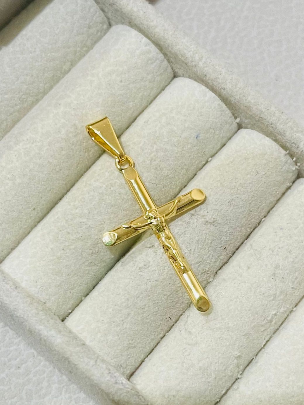 PINGENTE CRUZ ESTAMP C/ CRISTO 23MM SM BANHO DOURADO R$5,50